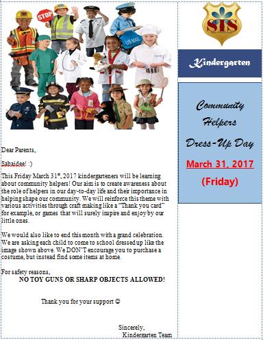 Dear Parents, Sabaidee! 🙂 This Friday March 31st, 2017 kindergarteners will be learning about community helpers! Our aim is to create awareness about the role of helpers in our day-to-day life and their importance in helping shape our community. We will…