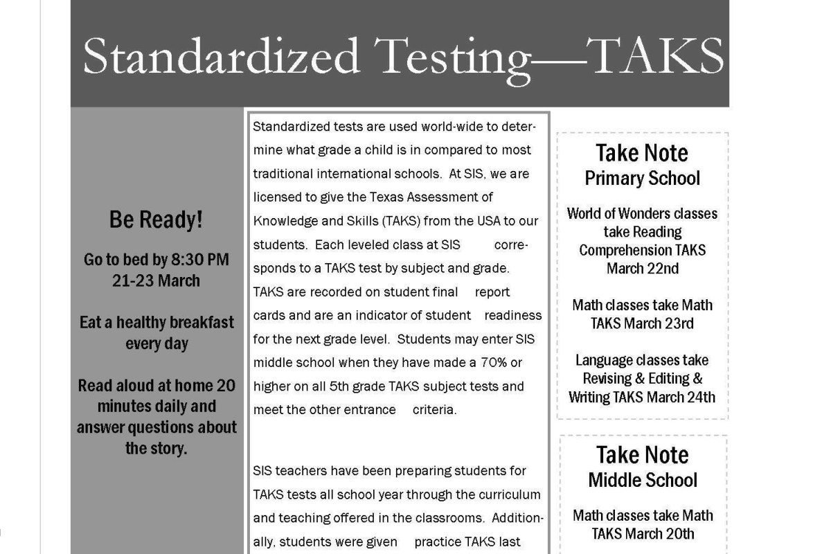 Standardized tests are used world-wide to determine what grade a child is in compared to most traditional international schools. At SIS, we are licensed to give the Texas Assessment of Knowledge and Skills (TAKS) from the USA to our students. …