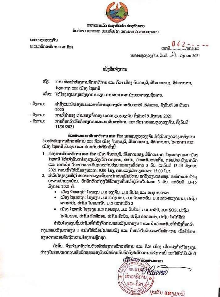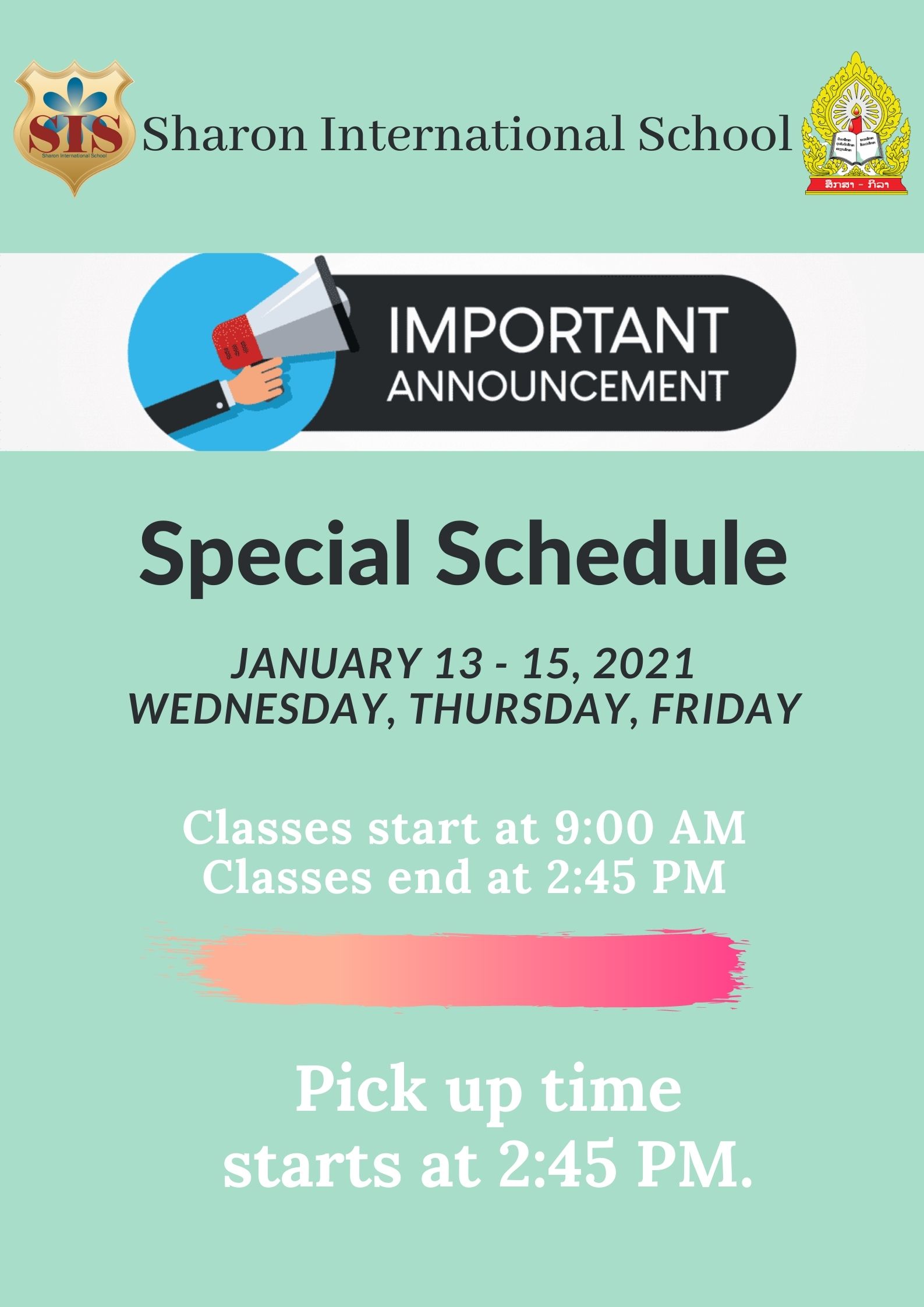 Due to an official memorandum forwarded from the Department of Education and Sports, Vientiane, Sharon International School announces its special class schedule this January 13 – 15, 2021 – Wednesday, Thursday, and Friday respectively.