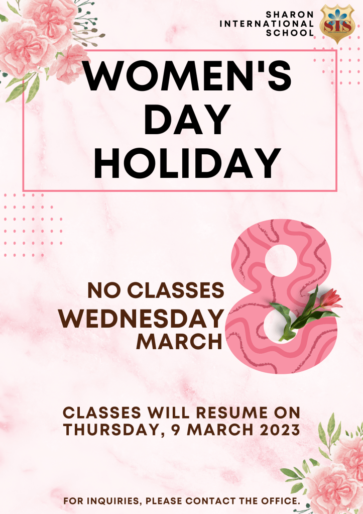 On Wednesday 8th March there will be no classes as SIS will be closed for Women’s Day. The school will reopen at the normal time on Thursday 9th March. Thank you.